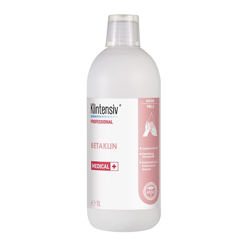 BETAKLIN este un dezinfectant lichid cu spectru larg antimicrobian (bactericid, levuricid, tuberculocid si virucid) recomandat in unitati sanitare si in domeniul casnic, pentru dezinfectia igienica si chirurgicala a mainilor si a pielii, prin frecare, respectiv dezinfectia preoperatorie/decolonizarea pielii. Contine iod activ ca agent antimicrobian.Grupa principala: 1 Tipul de produs: 1Domeniu de utilizare: Igiena umanaAria de aplicare: Dezinfectia igienica si chirurgicala a mainilor sau pielii prin frecare. Dezinfectarea preoperatorie/ decolonizarea pielii a personalului din unitati sanitare.Mod de utilizare: Pentru dezinfectia igienica a mainilor/pielii/dezinfectarea preoperatorie/ decolonizarea pielii personalului din unitati sanitare, prin frecare, se foloseste o cantitate suficienta (4 ml) pentru mentinerea umeda a acestora timp de 1 minut. In scopul obtinerii unor rezultate bune este indicata indepartarea inelelor, a unghiilor false, respectiv a altor accesorii care impiedica contactul direct al pielii cu produsul.Indicatii de utilizare: