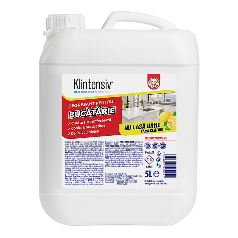 DEGRESANT BUCĂTĂRIEIndicatii de utilizare: Degresant bucatarie, conceput special pentru a reda luciul electrocasnicelor din bucatarie (cuptor cu microunde, cuptoare, frigidere, friteuze si hote), dar si pentru indepartarea petelor si curatarea in profunzime fara a lasa urme pe suprafetele din bucatarie sau blaturi de lucru.Mod de utilizare: Produsul se utilizeaza ca atare prin pulverizare pe toata suprafata de curatat. Se lasa un timp de contact de 30-45 secunde, apoi se curata prin frecare utilizand o laveta textila sau un burete moale. Se recomanda manusi de protectie pentru utilizarea produsului. Procedura de spalare se repeta daca au mai ramas depozite de murdarie.Asigura un strat de protectie, oferind un luciu sclipitor pe termen lung, usor de utilizat, nu este necesara clatirea.Acest produs de curatare versatil este, de asemenea, sigur de utilizat pentru: otel inoxidabil, metal cromat, cupru, aluminiu, zinc, sticla, ceramica, teflon, plastic, cauciuc.
