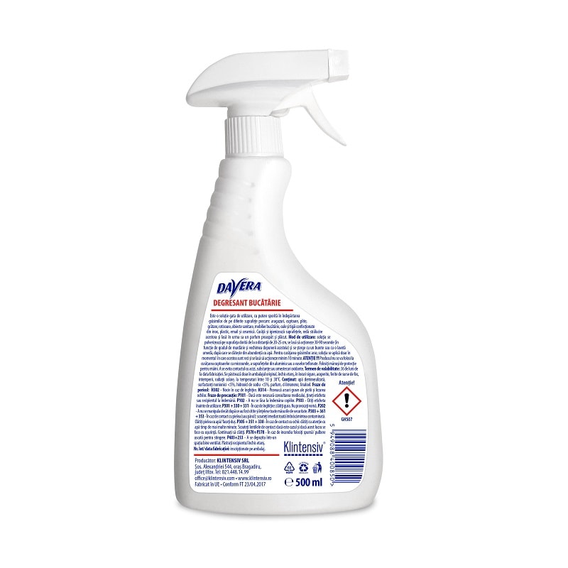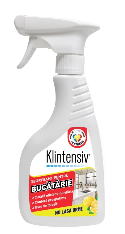 DEGRESANT BUCĂTĂRIEIndicatii de utilizare: Spray usor de utilizat, conceput special cu efect puternic de curatare a depunerilor de murdarie, resturi de alimente precum grasimi, proteine, amidon depuse pe suprafete.Mod de utilizare: Produsul se utilizeaza ca atare prin pulverizare direct pe toata suprafata. Dupa aplicarea produsului, se lasa timp de contact 30-45 secunde, apoi se curata prin frecare utilizand o laveta sau burete.Asigura un strat de protectie, oferind un luciu sclipitor pe termen lung, usor de utilizat, nu este necesara clatirea.Acest produs de curatare versatil este, de asemenea, sigur de utilizat pentru: otel inoxidabil, metal cromat, cupru, aluminiu, zinc, sticla, ceramica, teflon, plastic, cauciuc.