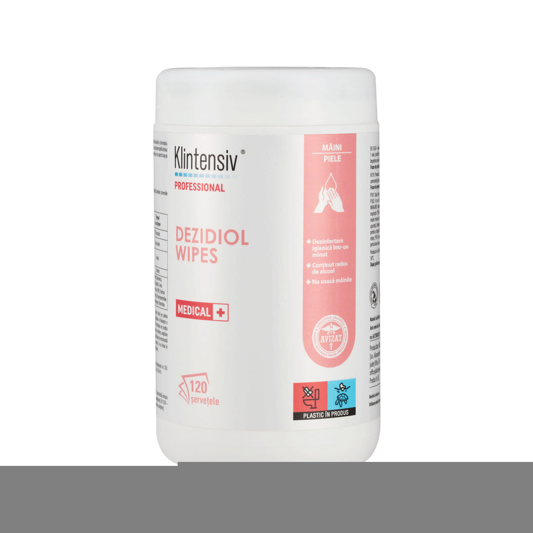 DEZIDIOL WIPES sunt servetele impregnate cu solutie dezinfectanta pe baza de alcooli si clorhexidina (Dezidiol Spray), utilizata pentru dezinfectarea prin frecare a mainilor.Se pot utiliza pe maini curate, prezinta actiune rapida pe un spectru larg microbian. Pot fi folosite zilnic datorita compozitiei cu caracter protectiv. Se utilizeaza ca atare, nu necesita clatire.Grupa principala: 1; Tipul de produs: 1MOD DE UTILIZARE: Tehnica de dezinfectare igienica a mainilor prin frecare: se foloseste o cantitate suficienta de servetele pentru mentinerea umeda a acestora timp de 2*30 secunde; cantitatea de produs utilizata este 2*1 buc. In scopul obtinerii unor rezultate bune, este indicata indepartarea inelelor, unghiilor false, respectiv alte accesorii care impiedica contactul direct al pielii cu produsul. Pentru atingerea efectului virucid general este necesara utilizarea unei cantitati de produs necesara mentinerii umede a mainilor timp de 2 minute.STANDARDE EFICACITATE BIOCIDĂ