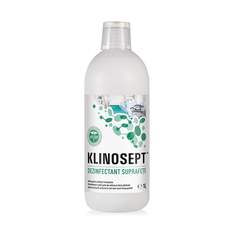 KLINOSEPT - dezinfectant rapid pentru suprafete RTU este o solutie dezinfectanta pe baza de alcool, gata de lucru, utilizata pentru dezinfectarea suprafetelor. Fara aldehide, fenoli, amine, clor si peroxizi.Formula eficienta pe un spectru larg de microorganisme, indicat pentru zonele cu risc mare de contaminare din unitatile medicale (zone de triaj, primiri urgente).