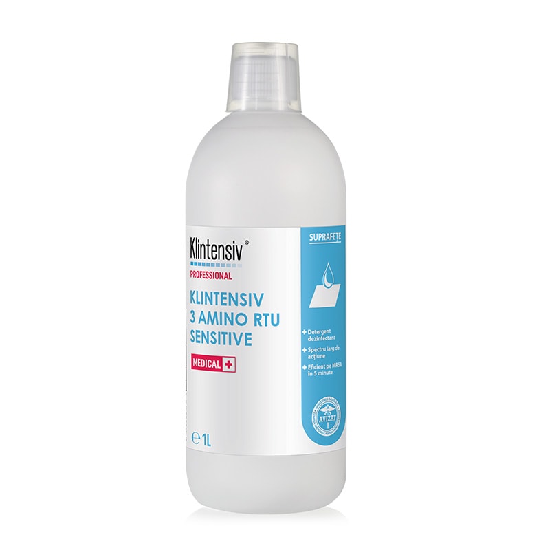 KLINTENSIV 3 AMINO RTU SENSITIVE este un detergent lichid destinat curatarii si dezinfectarii suprafetelor dure, respectiv instrumentarului/dispozitivelor medicale In unitati sanitare (spitale, clinici, cabinete medicale, ambulante, unitati primiri urgente, unitati medicale mobile s.a. Este potrivit si pentru dezinfectarea suprafetelor din unitati publice sau private. Datorita activitatii antibacteriane pronuntate poate fi utilizat In domeniul stomatologic pentru dezinfectarea mobilierului de lucru functional, suprafetelor din zona de asteptare pentru pacienti, amprentelor dentare si altor ustensile.
