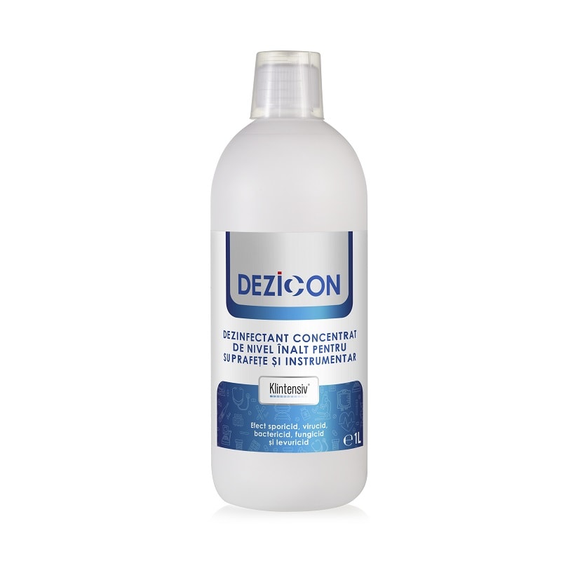 KLINTENSIV DEZICON este un lichid concentrat utilizat pentru dezinfectia suprafetelor, curatarea si dezinfectarea instrumentarului medical si chirurgical. Produsul, sub forma de solutie gata de lucru, este compatibil cu suprafete: metalice neacoperite (aluminiu, cupru, zinc, bronz, argint, aur, inox medical/ alimentar/ 314L/ 316L), metalice acoperite (vopsea, galvanizate, email, raini), plastice de diferite tipuri (PP, PE, HDPE s.a.), cauciuc, silicon, teflon, linoleum, lemn, compozite minerale (gresie, faianta, marmura, beton s.a.).Grupa principala: 1, Tipul de produs: 2Domeniul de utilizare: Dezinfectante si algicide care nu sunt destinate aplicarii directe la oameni sau animale.Aria de aplicare: Dezinfectant pentru suprafete, cu exceptia utilizarii pe suprafete care iau contact cu alimentele; dezinfectarea suprafetelor si a obiectelor de inventar din unitati sanitare cum sunt: mobilierul de spital, laboratoare de analize, brancarde, targi, carucioare, canapele de consultatii si tratament, mese de operatii, obiecte sanitare, clante de usi, telefoane etc.; dezinfectarea suprafetelor si a aparaturii medicale din cabinete stomatologice si cabinete medicale individuale, sali detratamente; dezinfectarea suprafetelor dispozitivelor medicale neinvazive (stetoscoape, termometre etc.); pre-dezinfectarea si curatarea instrumentarului medical si chirurgical inainte de procesul de dezinfectie; dezinfectarea suprafetelor dure neporoase din sectorul public (birouri, institutii de invatamant, sali de sport, sali de conferinte, spatii comerciale, gari, autogari etc.); dezinfectarea si igienizarea suprafetelor si obiectelor de inventar din saloane de cosmetica si coafura; dezinfectareasuprafetelor prin pulverizare electrostatica (no-touch disinfecting technologies) dezinfectia suprafetelor dure din industria farmaceutica.Indicatii de utilizare: