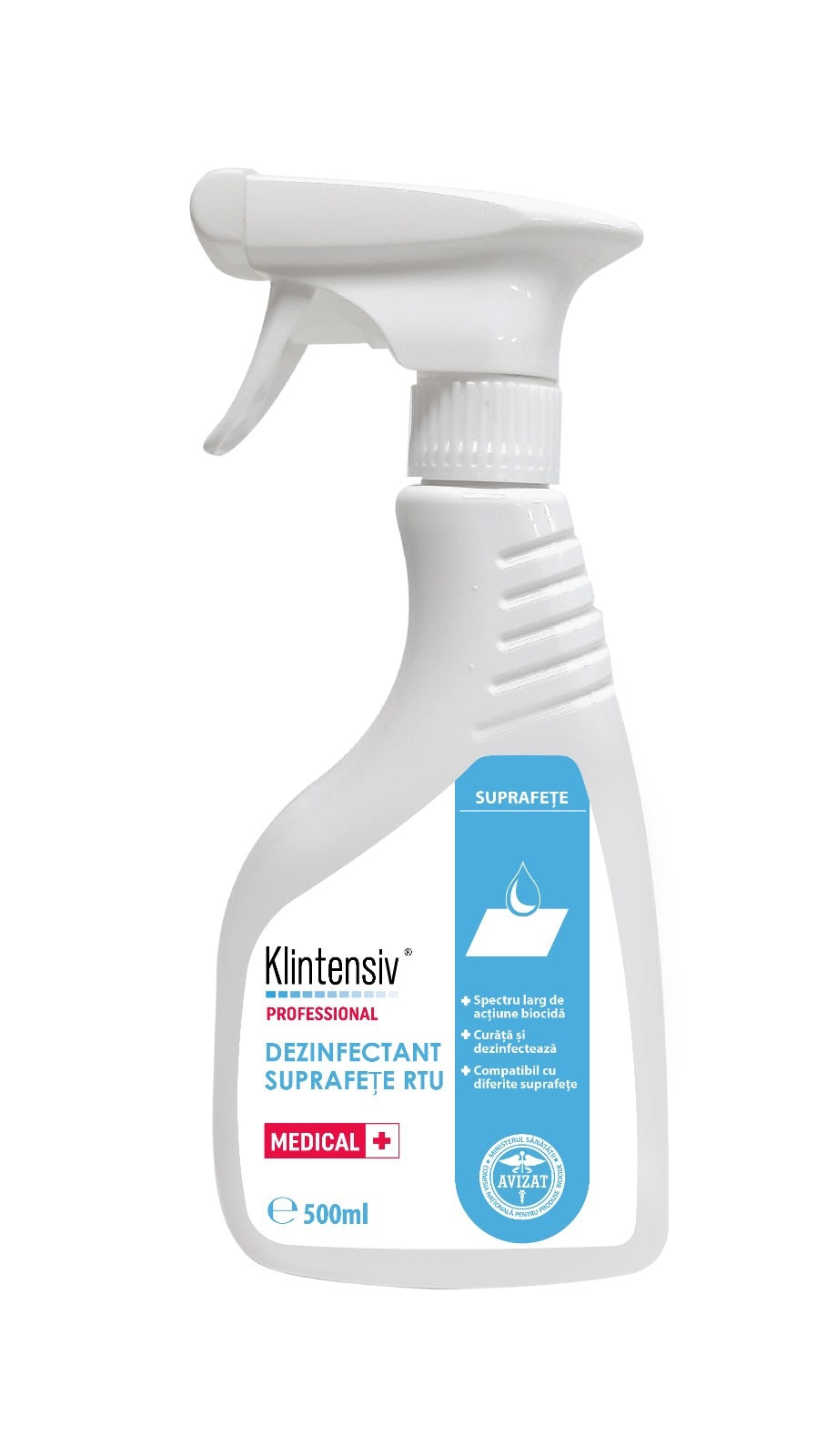 Sub forma de solutie cu proprietati dezinfectante, fara alcool si fara aldehide, produsul dispune de un spectru larg de actiune biocida. Datorita substantelor active (saruri cuaternare de amoniu), KLINTENSIV - Dezinfectant suprafete gata de utilizare este recomandat pentru suprafete delicate si opacizante, sensibile la atacul chimic al solutiilor pe baza de alcool.