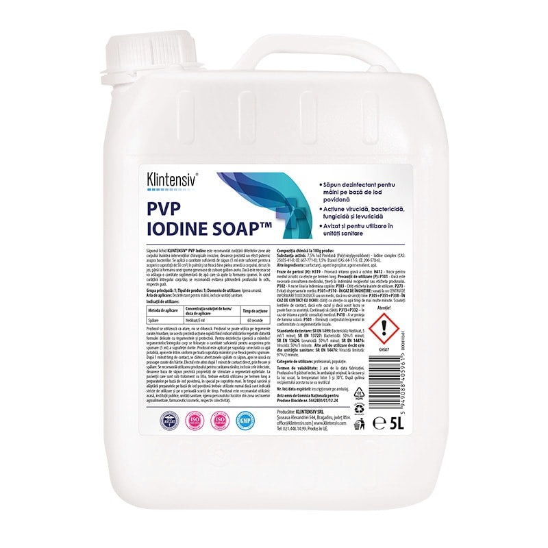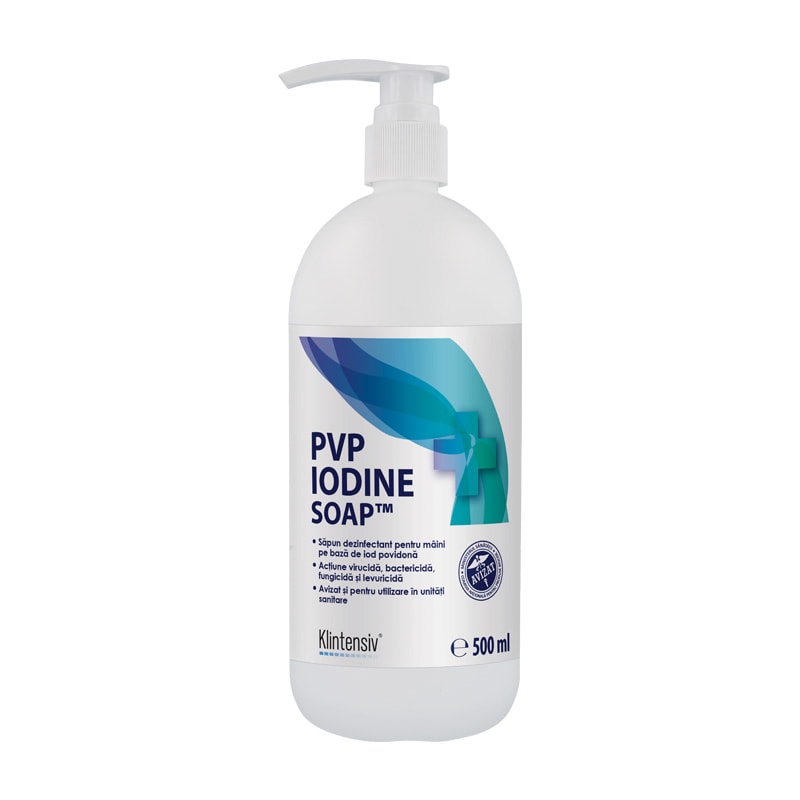 Klintensiv PVP Iodine este un dezinfectant lichid cu spectru larg antimicrobian (bactericid, levuricid, virucid, tuberculocid), recomandat pentru dezinfectia igienica a mainilor si tegumentelor prin frecare pentru unitati sanitare si in domeniu casnic. Contine iod activ ca agent antimicrobian.Se recomanda pentru:- antisepsia ranilor sau arsurilor superficiale de mica intindere,- tratament local pentru afectiunile pielii sau mucoaselor infectate sau cu risc de infectie,- dezinfectia preoperatorie a pielii si mucoaselor,- dezinfectarea mainilor personalului medical.Grupa principala: 1Tipul de produs: 1Domeniu de utilizare: Igiena umanaMetoda de aplicarePrin frecare pe tegumente uscate Concentratia solutiei de lucru Timp de actiune/ doza aplicataBactericida levuricida: nediluat / 4ml 1 minutVirucida: nediluat / 4ml 2 minuteFungicida, tuberculocida: nediluat / 4ml 3 minuteEficacitatea microbiologicaEficacitate Concentratie produs Timp de contactBactericida EN 13727 nediluat 1 minutBactericida EN 1500 nediluat, 4ml 1 minutLevuricida EN 13624 nediluat 1 minutVirucida EN 14476 nediluat 2 minuteTuberculocida EN 14348 nediluat 3 minuteCaracteristicile produsuluiCompozitie ingrediente active pentru 100g produs: Iod povidona 7,5%, EtanolAlte ingrediente: agenti umectanti si stabilizanti, apa;Descriere: Lichid brun inchis cu miros specific ingredientelor;pH = 3,5 ± 0,5Solubil in apa.Aria de aplicare: Produs biocid folosit pentru igiena umana aplicat pe sau care intra in contact cu pielea umana. Curatarea si dezinfectarea, prin spalare, a tegumentelor, in unitati sanitare, sectorul agro-alimentar, farmaceutic, colectivitati si casnic. Termen de valabilitate: 3 ani de la data fabricatiei. Produsul va fi pastrat inchis, in ambalajul original, in spatii uscate, la temperaturi intre 5 si 30°C. Dupa golirea recipientului acesta nu se va reutiliza!Aviz emis de Comisia Nationala pentru Produse Biocide nr. 6098BIO/01/12.24Producator: S.C. KLINTENSIV S.R.L.Str. Șos. Alexandriei nr. 544, Oras Bragadiru, Judet Ilfov