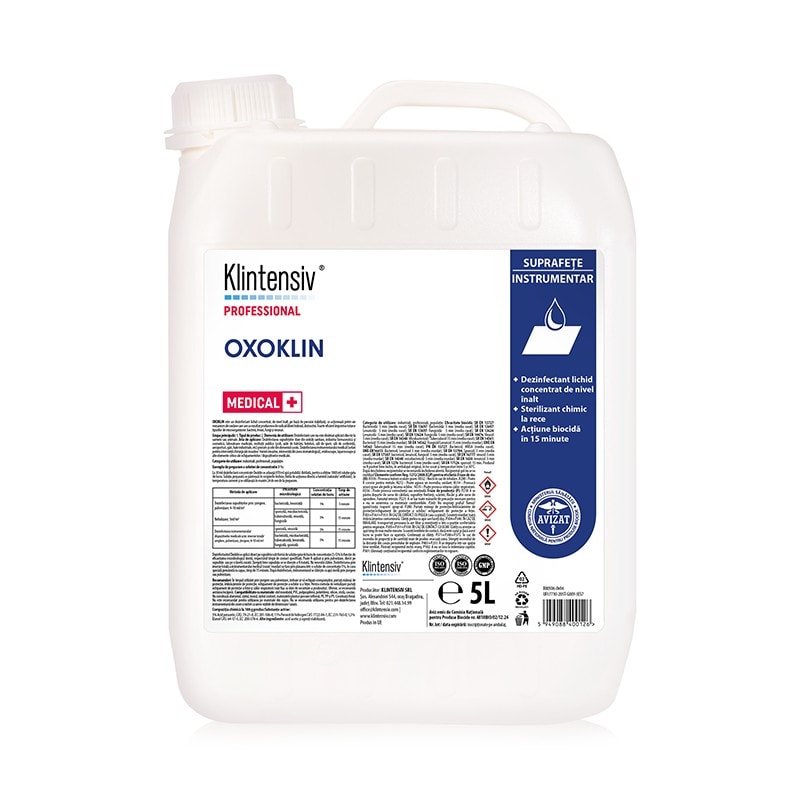 OXOKLIN este un lichid concentrat, ce actioneaza prin mecanism de oxidare pe un spectru inalt de agenti patogeni. Dezinfecteaza suprafetele dure din unitati sanitare sau laboratoare medicale si instrumentarul medical (seturi pentru interventii chirurgicale invazive/ minim invazive, interventii din zona stomatologica), endoscoape, laparoscoape sau alte elemente critice ale echipamentelor/dispozitivelor medicale.Grupa principala: 1Tipul de produs: TP2Domeniu de utilizare: Dezinfectante si algicide care nu sunt destinate aplicarii directe la oameni sau animale.Aria de aplicare: Dezinfectarea suprafetelor dure din unitatile medicale, spatii publice si private, industria farmaceutica si cosmetica. Dezinfectarea instrumentarului medical si dispozitivelor medicale.Categorie de utilizatori: industriali, profesionali, populatie.Instructiuni de utilizare: Produsul se dilueaza 3%-5% pentru solutia gata de lucru, in functie de eficacitatea microbiologica dorita. Indicatii de utilizare: