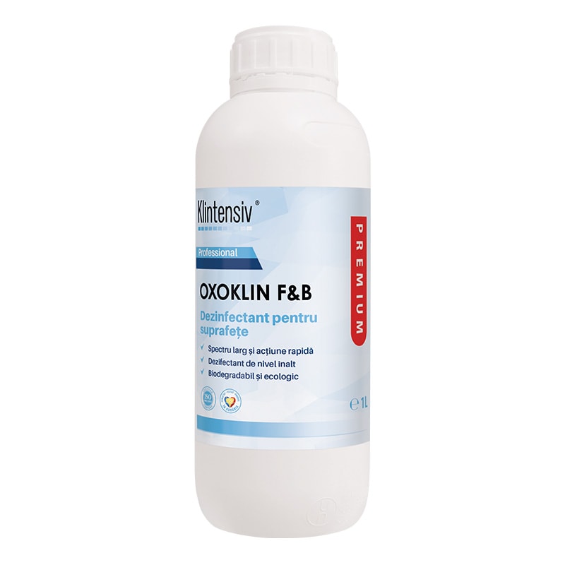 OXOKLIN F&B este un dezinfectant cu activitate ridicata de oxidare, pe baza de acid peracetic si apa oxigenata stabilizate, foarte eficient impotriva tuturor tipurilor de microorganisme: bacterii, levuri, fungi si virusuri. Peroxidul de hidrogen functioneaza prin producerea de radicali liberi hidroxil distructivi care pot ataca lipidele membranei, ADN-ul si alte componente celulare esentiale avand astfel o putere mare de dezinfectare. Grupa principala: 1; Tipul de produs: 4. Domeniu deutilizare: Dezinfectant lichid utilizat in industria alimentara si de preparare a furajelor. Aria de aplicare: Dezinfectarea suprafetelor echipamentelor, recipientelor, ustensilelor de consum, sau conductelor folosite pentru productia, transportul, depozitarea produselor alimentare sau hranei pentru animale (inclusiv apa potabila). Dezinfectie rezervoare, tevi, echipamente, in industria prelucratratoare a laptelui si bauturilor alcoolice / non-alcoolice. OXOKLIN F&B TP4 este utilizat pentrucuratarea si dezinfectarea: Suprafetelor de diverse tipuri din industria alimentara; Recipientelor, ustensilelor de consum folosite pentru productia, transportul si depozitarea produselor alimentare si hranei pentru animale; Rezervoare, tevi, echipamente, dezinfectie dupa curatarea prin tehnici manuale, WIP si CIP in industria alimentara.Mod de utilizare: