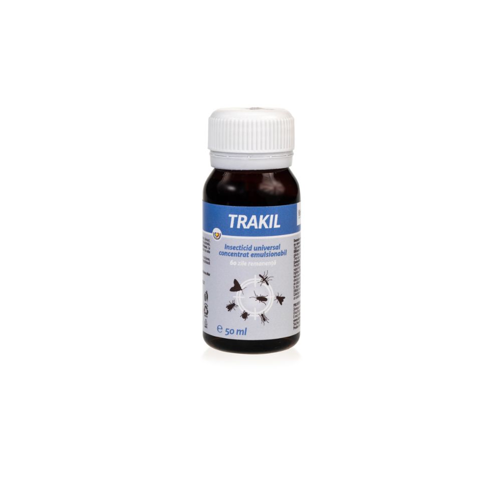 TRAKIL FORTE este un insecticid concentrat de contact si de ingestie, cu spectru larg de actiune special conceput pentru activitati de dezinsectie impotriva daunatorilor. Este usor si convenabil de utilizat atat in spatiile inchise, cat si in aer liber. A nu se utiliza in apropierea fermelor de pasari, acvacultura si animale producatoare de lapte pentru consum uman. A nu se utiliza pe suprafetele ce vin in contact direct cu alimentele, hrana pentru animale si produsele de origine animala. Produsul este toxic pentru albine si pesti. Piperonil butoxidul inhiba oxidarea piretroizilor in organismul insectelor, prelungind degradarea insecticidului si potenteaza efectul acestora. Solutia antiparazitara, care datorita componentilor, odata cu diluarea acesteia cu apa formeaza o emulsie laptoasa, prevenind consumul accidental de catre manipulator.Indicatii de utilizare: Se aplica numai diluat in apa astfel: 300ml la 10L apa impotriva insectelor taratoare (gandaci, purici, furnici) cu timp de actiune 180 de minute; 150ml la 10L apa impotriva insectelor zburatoare (muşte, ţanţari, molii) cu timp de actiune 30 de minute. Rata de aplicare: 50 ml solutie lucru/mp.Mod de utilizare: TRAKIL FORTE poate fi aplicat prin pulverizare utilizand diferite echipamente specifice cum ar fi: pulverizatoare tip pompa manuala (vermorel) sau echipamente de mare putere cum sunt atomizoarele, foggere de ceata rece. Utilizatorii casnici vor utiliza pentru aplicare pulverizatoare tip vermorel de 1-2 litri sau sticle cu pulverizator, iar in lipsa mijlocului de pulverizare, cu ajutorul unei pensule sau a altui mijloc potrivit acestui scop, cu condiţia sa se evite contactul cu pielea şi ochii.Operatorii profesionisti care realizeaza dezinsectia, este recomandat sa poarte manusi de protectie (cauciuc nitrilic PVA), masca de protectie a fetei si combinezon, la prepararea solutiei de lucru si in timpul aplicarii produsului. Dupa pulverizare, se paraseste incaperea si se mentin inchise geamurile si usile: 30 minute in cazul combaterii insectelor zburatoare si 2-3 ore in cazul combaterii insectelor taratoare. Recipientele de plastic se clatesc de cateva ori, apoi se recicleaza. Ambalajele goale nu se vor folosi pentru depozitarea altor produse.Tipul amestecului: lichid emulsionabil concentrat de culoare galbuie, cu miros caracteristic. TRAKIL FORTE este un insecticid cu o raza mare de actiune, prezentand urmatoarele proprietati: remanenta de minim 60 de zile datorita continutului de piretroizi din compozitia TRAKIL FORTE, durata reziduala a produsului depinzand insa de: natura suprafeţelor de tratat, gradul şi tipul infestarii, temperatura şi umiditate, dozele de utilizare, frecvenţa operaţiunilor de curaţenie; daca se respecta indicatiile de utilizare spatiile tratate nu prezinta riscuri pentru oameni si animale; se poate utiliza pentru spatii alimentare, birouri, hoteluri, mijloace de transport marfa, depozite de animale si fabrici. La concentratiile recomandate de utilizare, produsul nu este fitotoxic, are toxicitate redusa pentru operator, animal si mediu.Categorie de utilizatori: idustriali şi populaţie.Termen de valabilitate: 2 ani de la data fabricaţiei.Avizat de Ministerul Sanatatii sub nr. 4390BIO/18/12.24Producator: DEZINFECȚIE ȘI DERATIZARE SRL,COM.Ulmi, sat Mostei, nr.42, jud.Giurgiu, RomaniaProdus pentru: KLINTENSIV SRLȘoseaua Alexandriei 544, oras Bragadiru, judet Ilfov